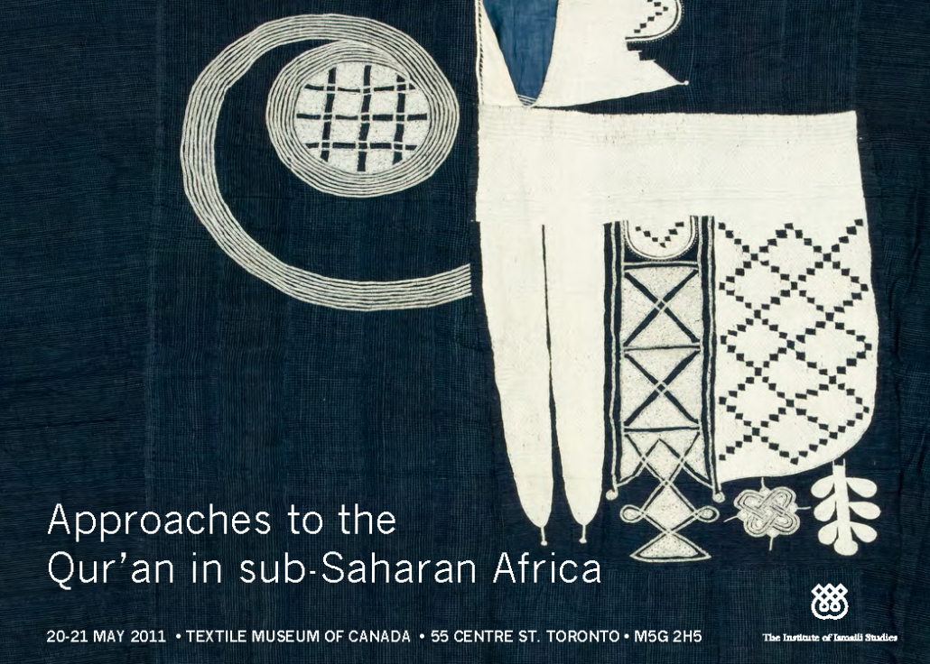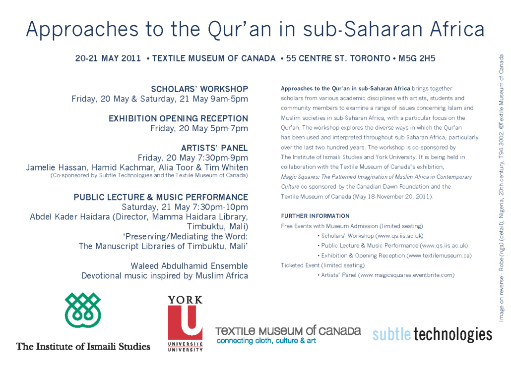 Held at the Textile Museum of Canada from May 19–21, 2011, Approaches to the Qur’an in sub-Saharan Africa brought together scholars from various academic disciplines with artists, students and community members to examine a range of issues concerning Islam and Muslim societies in sub-Saharan Africa, with a particular focus on the Qur’an. The workshop explored the diverse ways in which the Qur’an has been used and interpreted throughout sub-Saharan Africa, particularly over the last two hundred years. The workshop was co-sponsored by The Institute of Ismaili Studies, Subtle Technologies, The Textile Museum of Canada, York University,  and was held in collaboration with the Textile Museum of Canada’s exhibition, Magic Squares: The Patterned Imagination of Muslim Africa in Contemporary Culture, curated by Patricia Bentley.